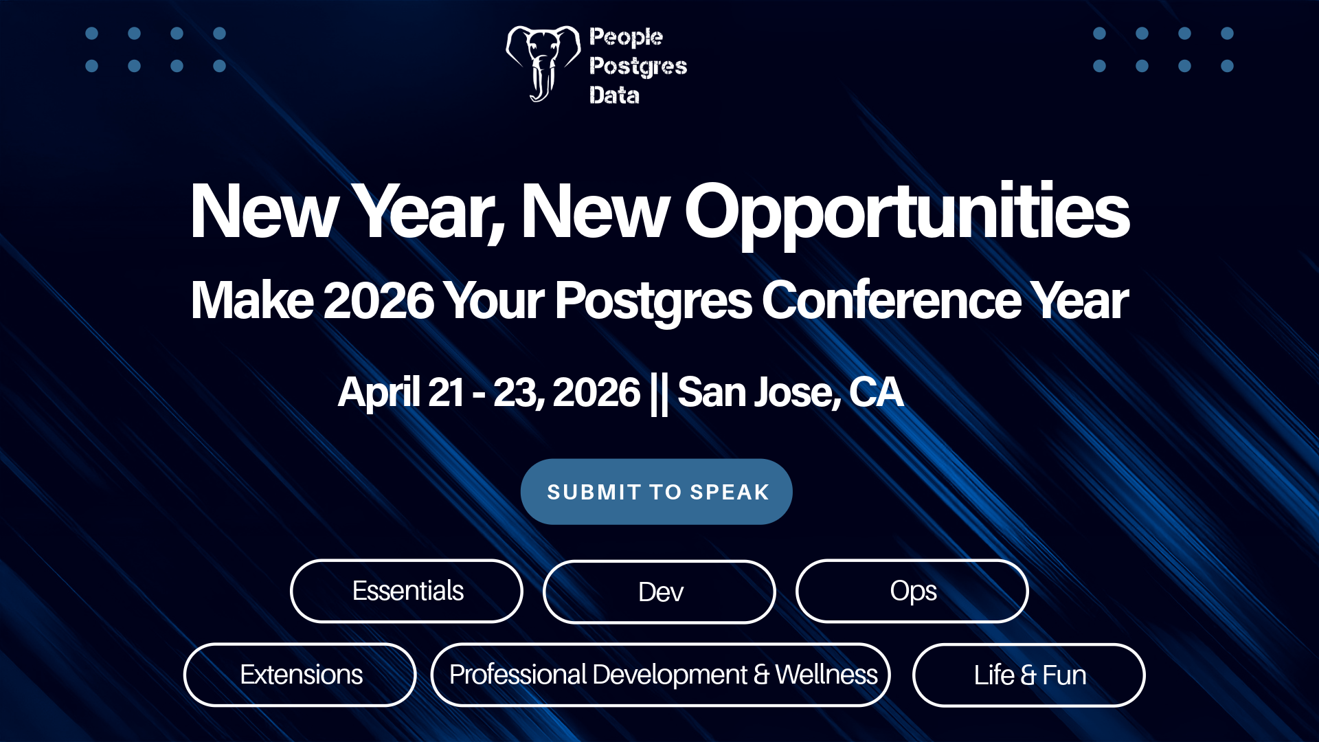 Postgres Conference 2026 takes place April 21-23 in San Jose, California.